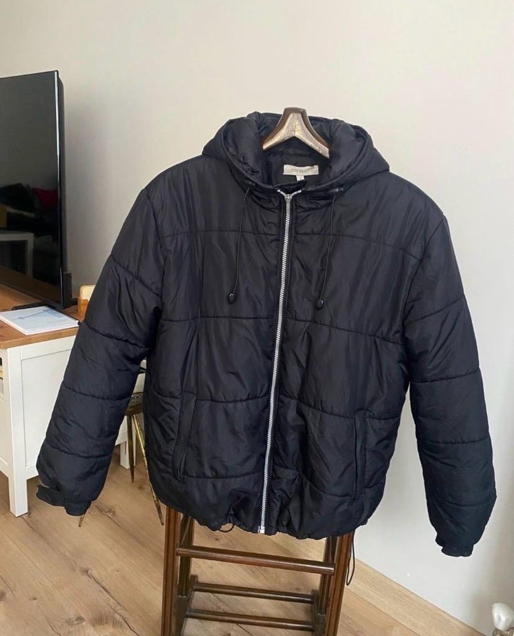 Siyah kapüşonlu kadın mont, fermuarlı ve yumuşak sentetik kumaştan. Uzun kollu, midi boy ve günlük kullanıma uygun. Tek kusuru fermuarın tutamacı yok,ama oraya bir şey takılabilir.ürün 1 beden.