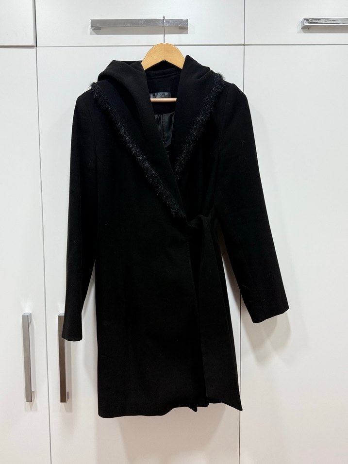 Siyah kapüşonlu, kemerli kadın kabanı, yumuşak ve sıcak kumaştan, ön kenarlarda hafif dokulu detaylarla. Soğuk havalar için uygun. Beden 42 fakat boylu ve zayıf birine 38-40 beden aralığınada tam olur