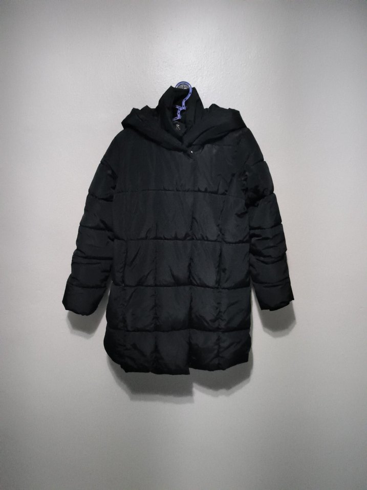Fermuarlı, siyah, normal boyda kadın kış montu. Rahat ve şık, günlük kullanıma uygun, fit kesim. eni45 boy80