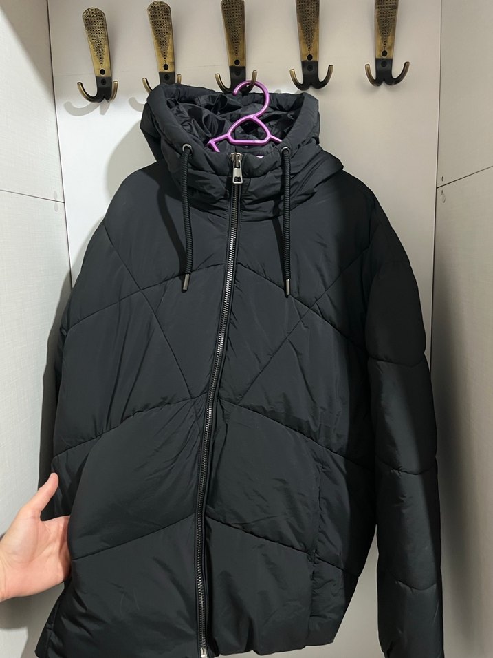 Siyah, yüksek yakalı kapüşonlu ve fermuarlı, sentetik kumaştan yapılmış fitted kış montu. Midi boyda, desen içermeyen sade tasarıma sahiptir. Sayılı kullanıldı yepyeni kadın montu.