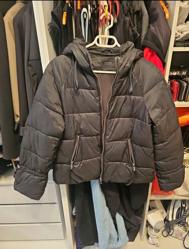 Siyah kapüşonlu kadın kısa kış montu, fermuarlı cepler ve rahat dolgu yapısıyla günlük kullanım için uygundur. ❄️