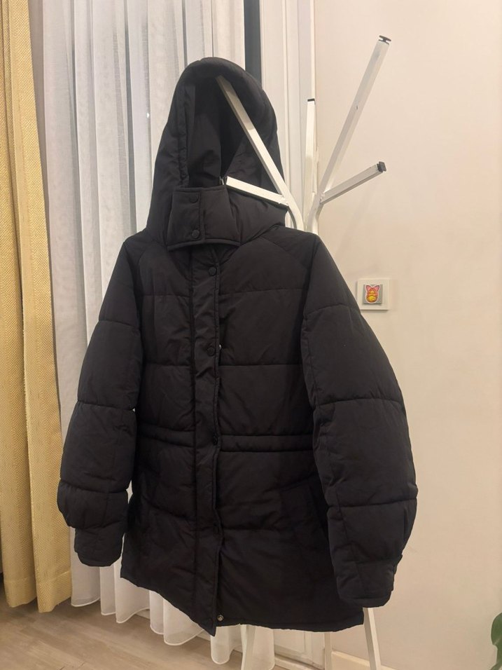 Siyah, yüksek yakalı ve fermuarlı kadın kışlık mont. Uzun kollu, bol kesim ve yumuşak, sıcak tutan kumaştan yapılmıştır.Beden xs ancak S ve M bedene de uygundur.