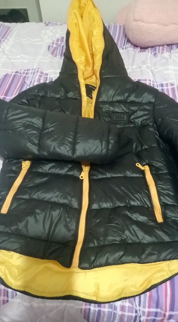 Siyah ve sarı detaylı, kapüşonlu, fermuarlı cepli, sentetik kumaştan yapılmış, uzun kollu, midi boy, dar kesim kadın kışlık mont.