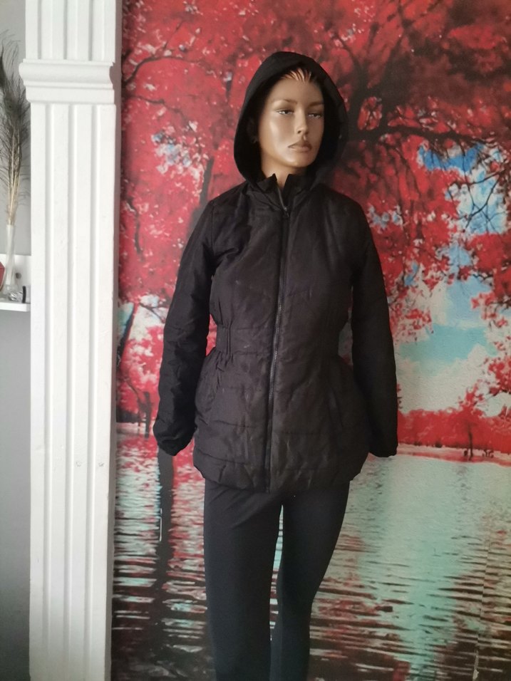Yumuşak fleece kumaştan, siyah kapüşonlu ve fermuarlı, yüksek yakalı, uzun kollu kadın kışlık mont. Orta boy ve dar kesim, sokak stiline uygun. Sırt kısmında minik bir takılması var resimde mevcut