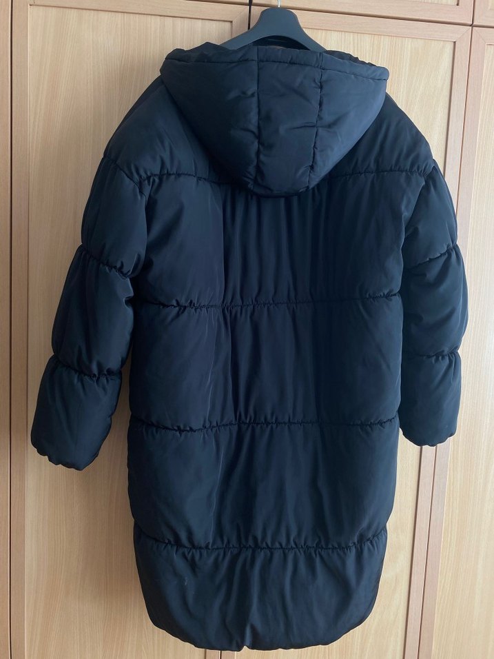 Siyah, kapüşonlu ve fermuarlı kadın kışlık mont. Yumuşak dokusu ve midi boyu ile rahat ve sıcak tutar. Şehir stiline uygun, normal kesim tasarım.