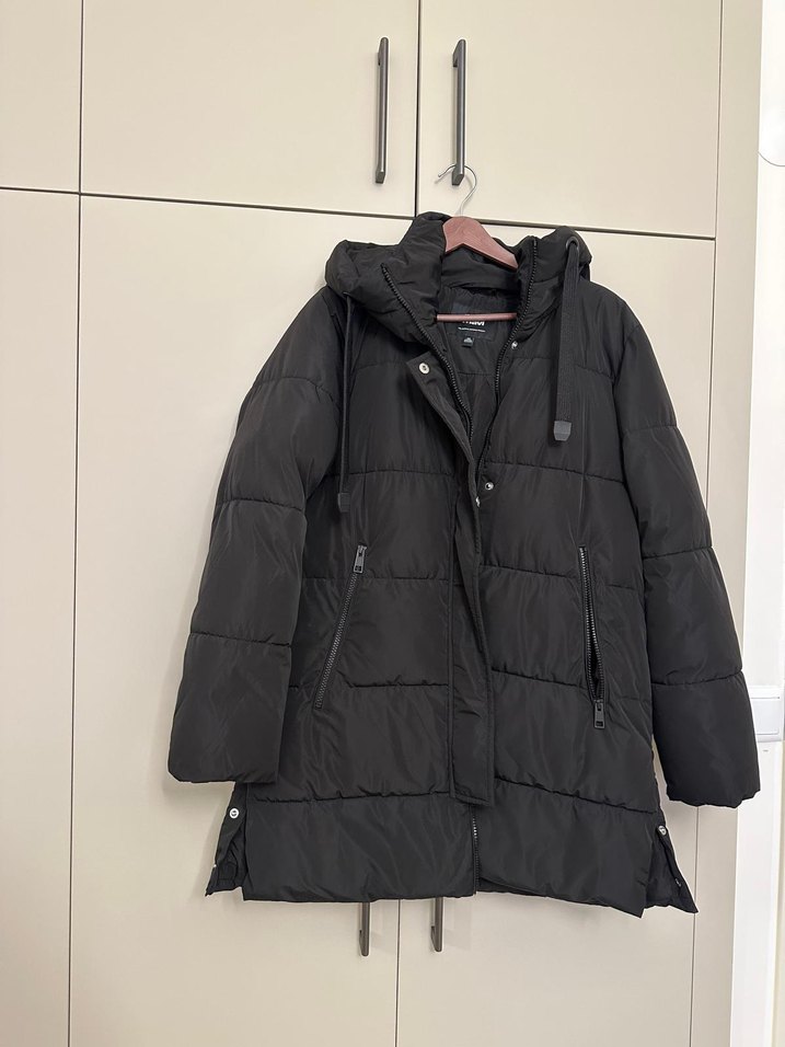 Siyah renkte, kapüşonlu, fermuarlı cepleri olan, rahat kesim kadın kışlık mont. Orta boy ve sıcak tutan yumuşak kumaştan üretilmiştir, günlük kullanıma uygundur.
