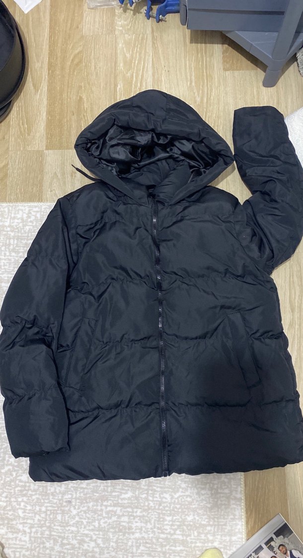 Siyah, kapüşonlu ve fermuarlı kadın kışlık mont. Uzun kollu, fitted kesim ve sıcak tutan astarlı, günlük kullanıma uygun. 68 cm boy 52 cm kol