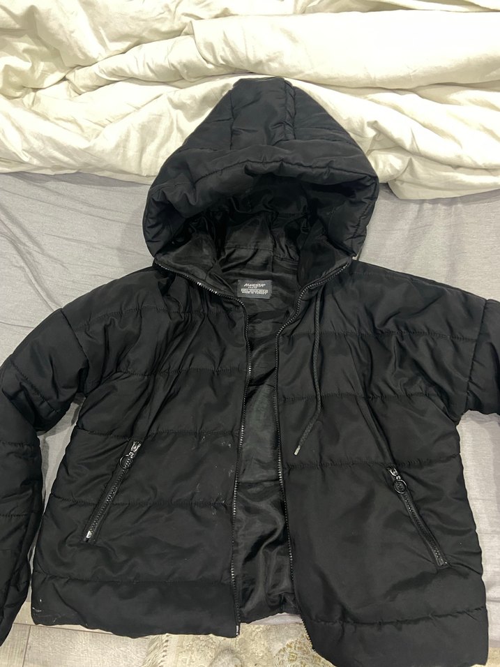 Siyah renkte, kapüşonlu ve fermuarlı kadın kışlık mont. Yüksek yakalı, uzun kollu ve vücuda oturan kesimiyle sıcak tutar. Dış mekanlar için uygun, rahat ve sıcak kumaştan üretilmiştir. ❄️ Fotoğrafta gösterildiği gibi kapsonuna minik bi dikiş atılmıştır kapsonu arkaya atınca görünmüyor uzaktan da belli olmuyor ve fermuarının ucu kopuk fermuarı kullanmaya engel değildir terziden değiştirebilirsiniz fermuarı başka bi kusuru yoktur lekeleri var hic temizlettirmedim