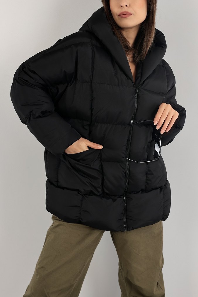 Siyah Kapüşonlu Kadın Midi Kış Montu