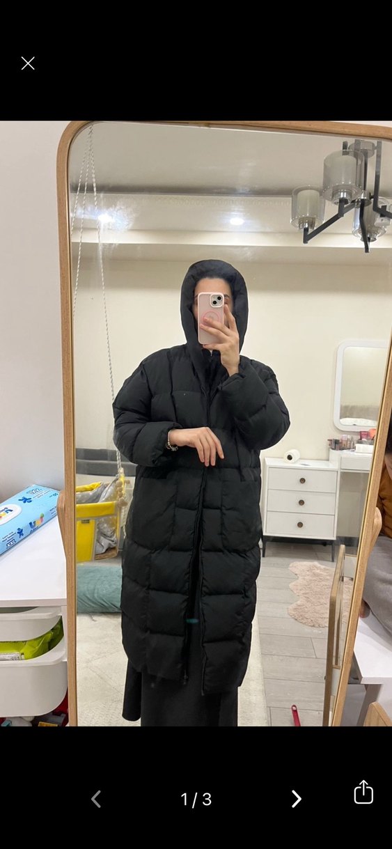 Siyah renkte, yüksek yakalı ve bol kesim midi uzunluğunda kadın kışlık şişme mont. Uzun, şişme kollara sahip, yumuşak ve sıcak kumaş kullanılmıştır.
