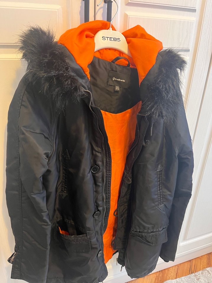 Kapüşonlu, kürklü detaylı, turuncu iç astarlı siyah kadın kışlık mont. Midi boy, uzun kollu ve desen içermeyen sokak stili rahatlığı sunar.