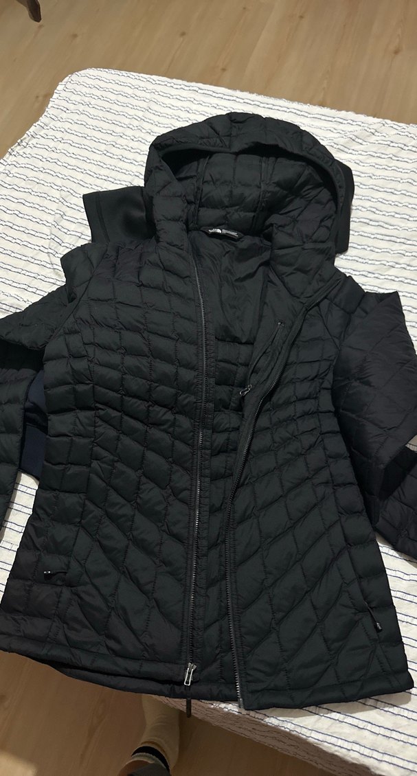 Siyah, fermuarlı, kapüşonlu ve ince kesime sahip kadın mont. Yumuşak sentetik kumaştan, midi boyda, desen içermeyen rahat bir tasarım.