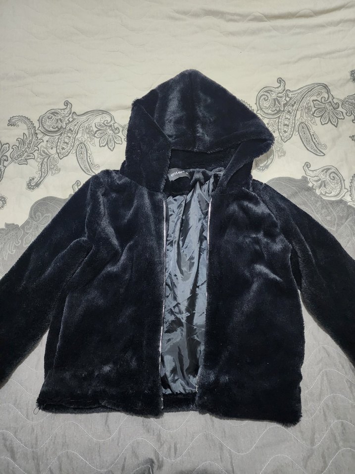 Siyah kapüşonlu, uzun kollu, bol kesim kadın peluş ceket. Yumuşak kumaştan, notlu yakalı ve midi boyda, günlük kullanım için uygundur. udtten boy 58 alttan en 53 cm