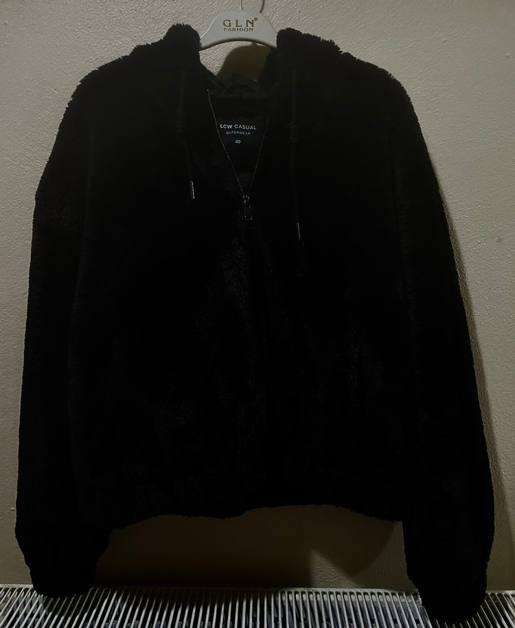 Siyah kapüşonlu ceket, bol kesim ve peluş detaylara sahip. Yumuşak ve sıcak dokusuyla, uzun kollu ve normal midi boyda, günlük kullanım için uygundur.