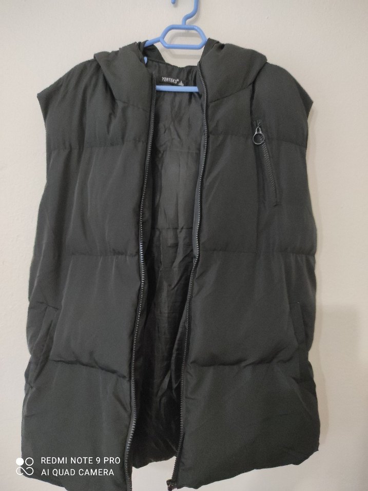 Siyah renkte, yüksek yakalı, fermuarlı ve sentetik kumaştan yapılmış, Rahat ve şık sokak stili için uygundur. şişme mont sadce tek cebin içi yırtık başka deformu yok. renk solması yok