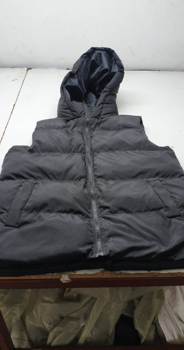 Siyah renkte, kapüşonlu ve fermuarlı, yumuşak ve sıcak kumaştan yapılmış kolsuz kadın yelek. Düz ve normal boyda, dış mekan kullanımı için uygun. küçük bir dikiş hatası olmuştur