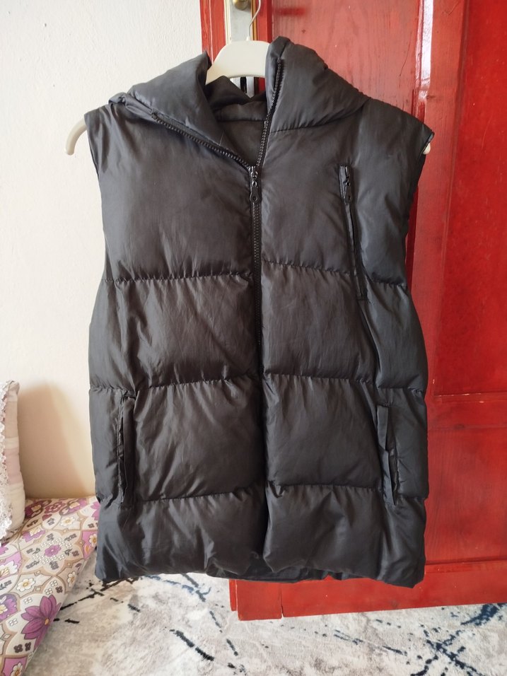 Siyah, kapüşonlu ve fermuarlı, yüksek yakalı kadın şişme yelek. Sentetik kumaştan, midi boy ve dar kesim, günlük kullanıma uygun.
