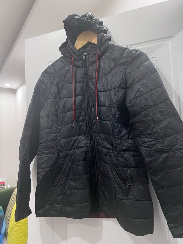 Siyah, kapüşonlu, fermuarlı ve uzun kollu bu kadın montu, sentetik kumaştan yapılmıştır. Notlu yaka ve midi boydadır, günlük sokak stili için uygundur.
