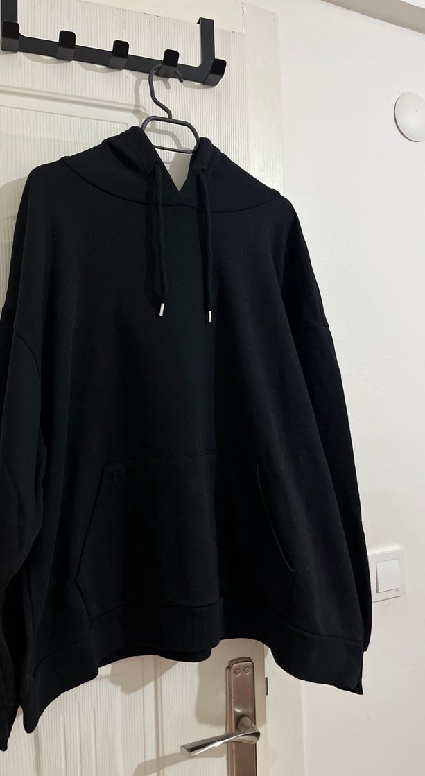 Siyah kapüşonlu sweatshirt, bol kesim ve uzun kollu, yumuşak ve sıcak kumaştan günlük rahatlık sunar. Minimalist tasarımıyla zahmetsiz şıklık sağlar.