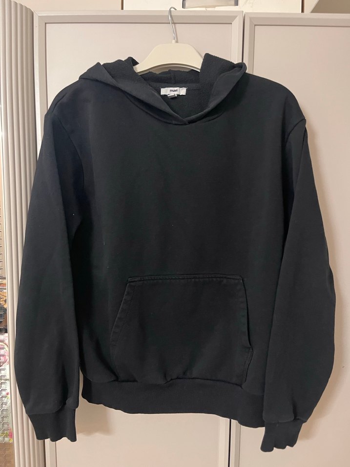 Siyah kapüşonlu, yuvarlak yaka ve uzun kollu kadın sweatshirtü. Rahat kesimi ve yumuşak, sıcak kumaşıyla gündelik kullanım için uygundur. Desensiz, sade tasarıma sahiptir.
