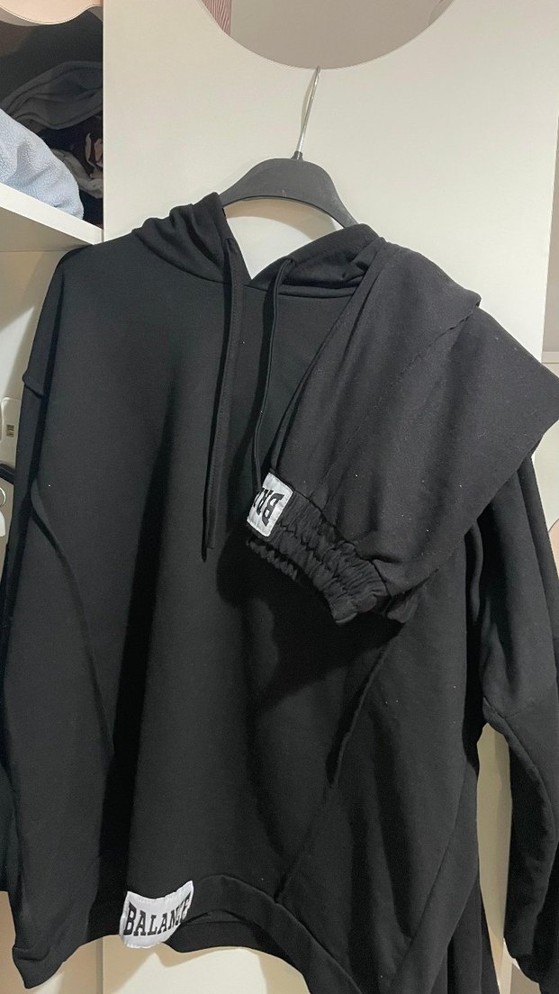 Siyah kapüşonlu sweatshirt, bol kesim ve uzun kolludur. Yumuşak kumaştan üretilmiş, günlük kullanıma uygundur ve midi boydadır.