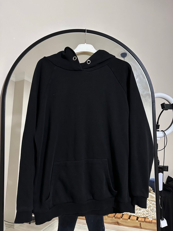 Bu siyah kadın sweatshirtü, yuvarlak yaka, uzun kollu ve normal uzunlukta bol kesime sahiptir. Yumuşak ve sıcak kumaştan üretilmiş olup günlük kullanıma uygundur. Defosu yoktur boyu 66 cm dir renginde solma yoktur ışıktan dolayı öyle durmuş çok kullanılmamıştır