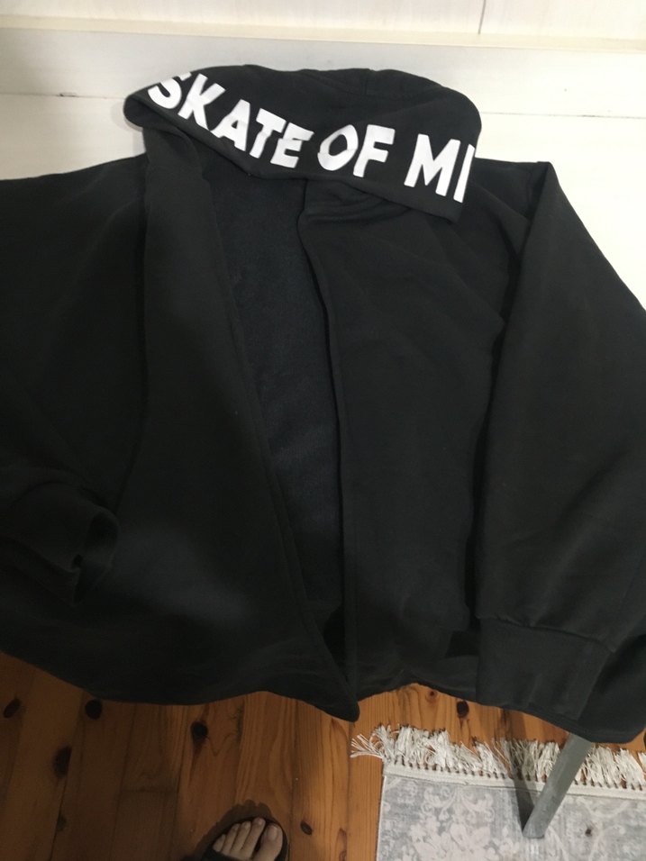 Siyah kapüşonlu sweatshirt, bol kesim, uzun kollu ve yırtmaç detaylıdır. Kapüşonda "SKATE OF MI" baskısı bulunur, spor ve günlük kullanıma uygundur.