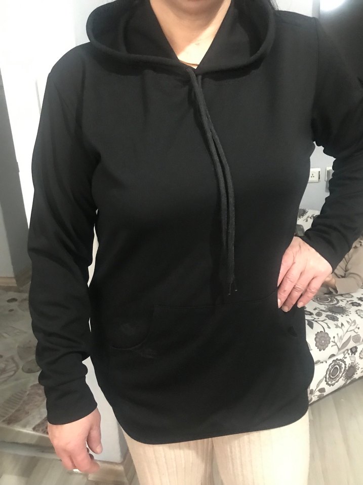 Siyah renkli, kapüşonlu ve uzun kollu kadın sweatshirtü, yumuşak kumaştan ve dar kesim olarak tasarlanmıştır. Rahat ve şık bir günlük kullanım seçeneği sunar.