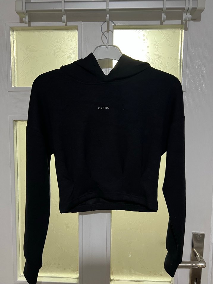 Siyah kapüşonlu, uzun kollu ve vücuda oturan kesime sahip, yumuşak ve sıcak kumaştan üretilmiş kadın sweatshirtü.