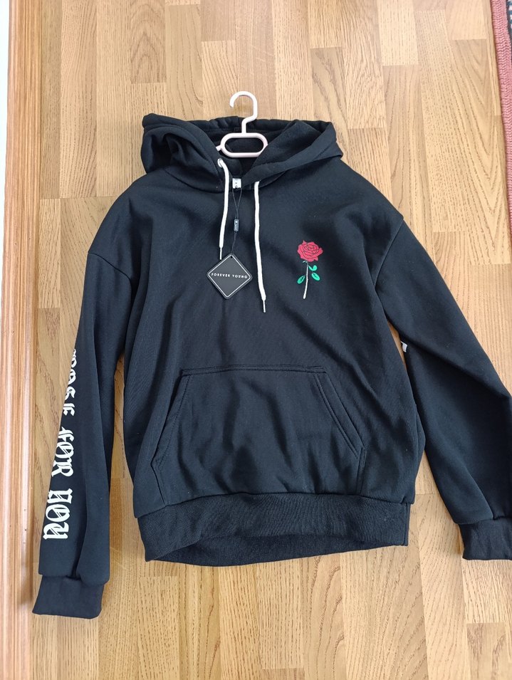 Siyah kapüşonlu kadın sweatshirt, uzun kollu ve bol kesim. Fermuarlı yaka, baskılı gül deseni ve ön cep bulunur. Yumuşak kumaştan üretilmiştir.