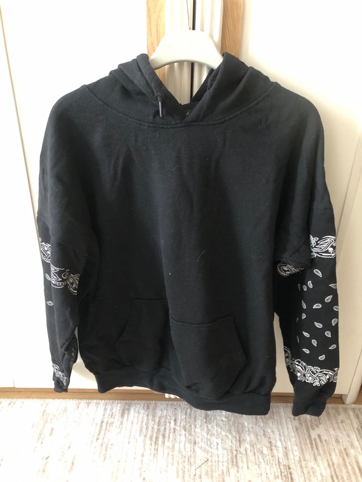 Siyah kapüşonlu sweatshirt, uzun kollu ve kollarda bandana desenli örgü detaylıdır. Rahat kesim ve normal boyda, yumuşak ve sıcak kumaştan üretilmiştir.