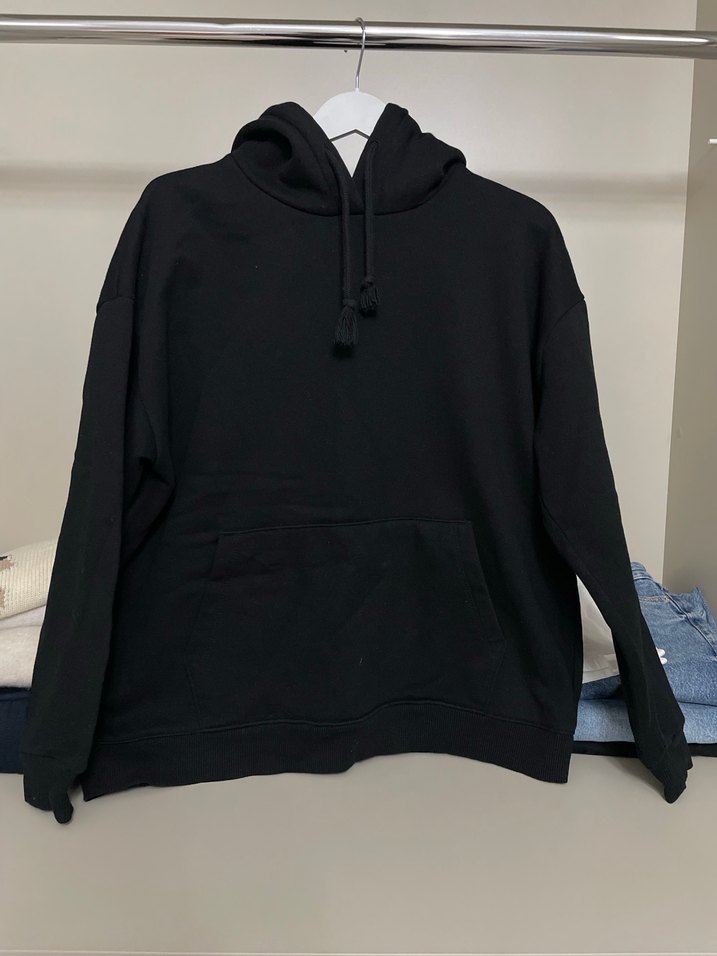 Siyah kapüşonlu, bol kesim ve uzun kollu, yumuşak ve sıcak kumaştan sweatshirt. Ön cep ve sade desensiz tasarım, günlük kullanım için uygundur.