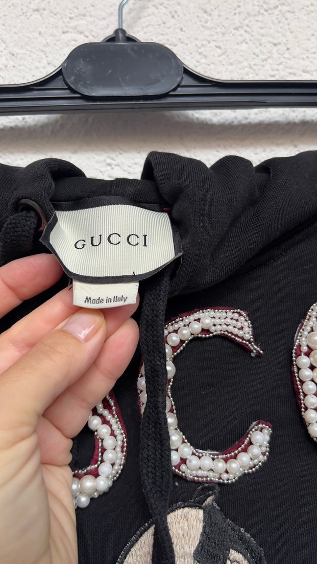 Gucci imzalı, İtalya yapımı, siyah pamuklu kapüşonlu sweatshirt. Uzun kollu, nakışlı ve payet detaylı, rahat ve şık bir parça.