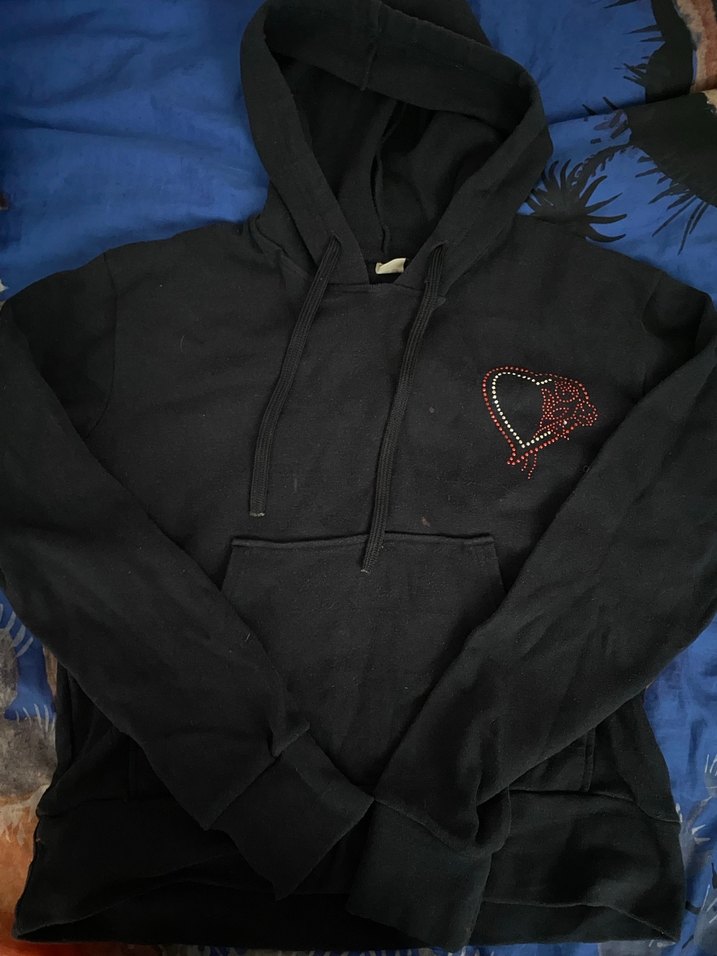 Baza altından çıktı yıkanınca bi sıkıntısı yok marka temsili Siyah kapüşonlu, uzun kollu ve bol kesim kadın sweatshirt. Yumuşak kumaştan, payetli ve işlemeli detaylara sahip. Rahat sokak stili için uygun.
