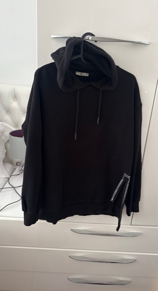 Siyah renkli, kapüşonlu ve fermuarlı kadın sweatshirtü, bol kesimi ve yumuşak dokusuyla rahat bir kullanım sunar.
