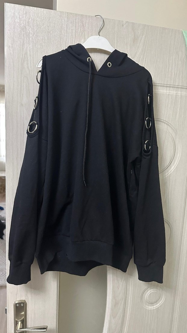 Siyah kapüşonlu, kemerli ve metal halkalı askılı kollara sahip bol kesim sweatshirt. Yumuşak ve sıcak kumaştan, midi boyda, gotik tarzda günlük kullanım için uygun.