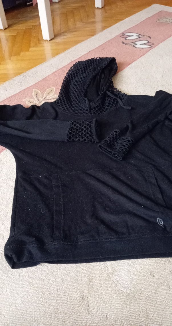Siyah kumaştan, kapüşonlu ve file detaylı, bol kesim, uzun kollu, kadın sweatshirt