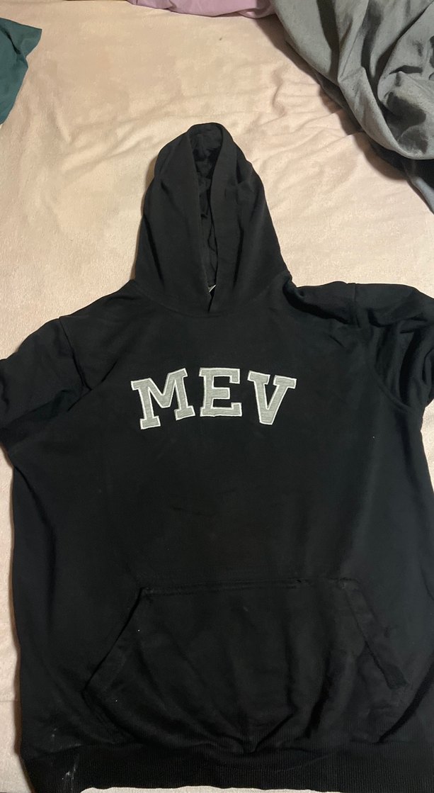 Siyah kapüşonlu, uzun kollu ve bol kesim kadın sweatshirt. "MEV" baskılı ve cırt cırt detaylı, yumuşak ve sıcak kumaştan yapılmıştır.