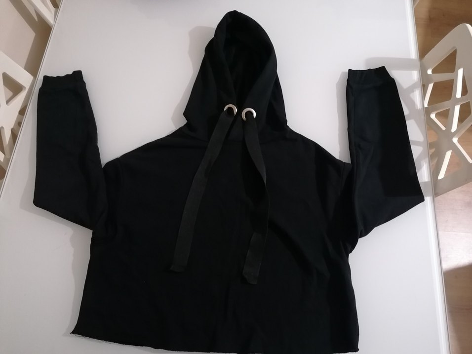 Siyah kapüşonlu sweatshirt, bol kesim ve kemerli tasarıma sahiptir. Yumuşak, sıcak kumaştan üretilmiş olup midi boydadır ve günlük kullanım için uygundur. Koton sweatshirt. Birkaç kez giyildi sorunsuz deformesiz. S ve m bedene uygun