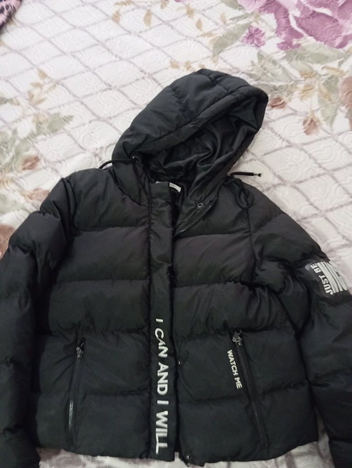Bu siyah, kapüşonlu, uzun kollu ve kısa kesim kadın kışlık mont, kürk detaylıdır ve 'CAN AND I WILL' yazısı ile dikkat çeker. s bedene de olur