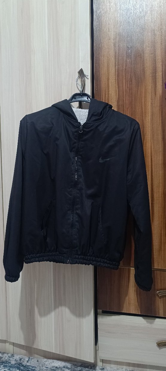 Siyah, kapüşonlu ve uzun kollu, bol kesim ve fermuarlı kısa mont Sentetik kumaştan, günlük kullanım için uygundur. ️