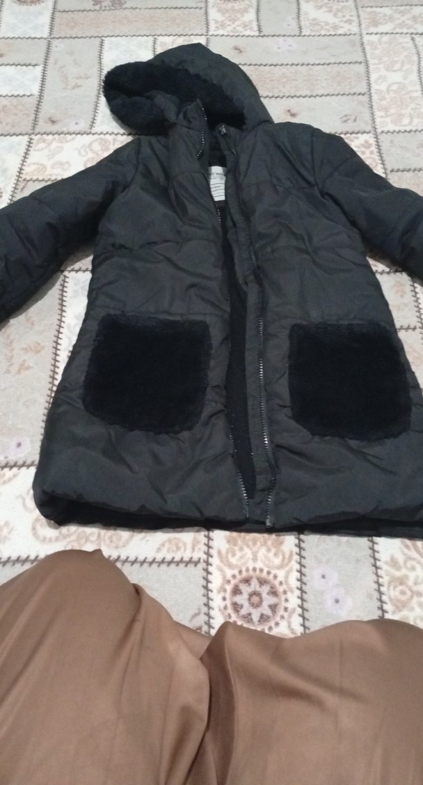 Uzun kesim, kapüşonlu siyah kız çocuk kışlık mont. Sıcak ve yumuşak kumaş, cep detaylarında kürk bulunur. Günlük sokak stiline uygun. yırtık sökük yok iç kısmında biraz tülerme var sadece sıcacık tutar