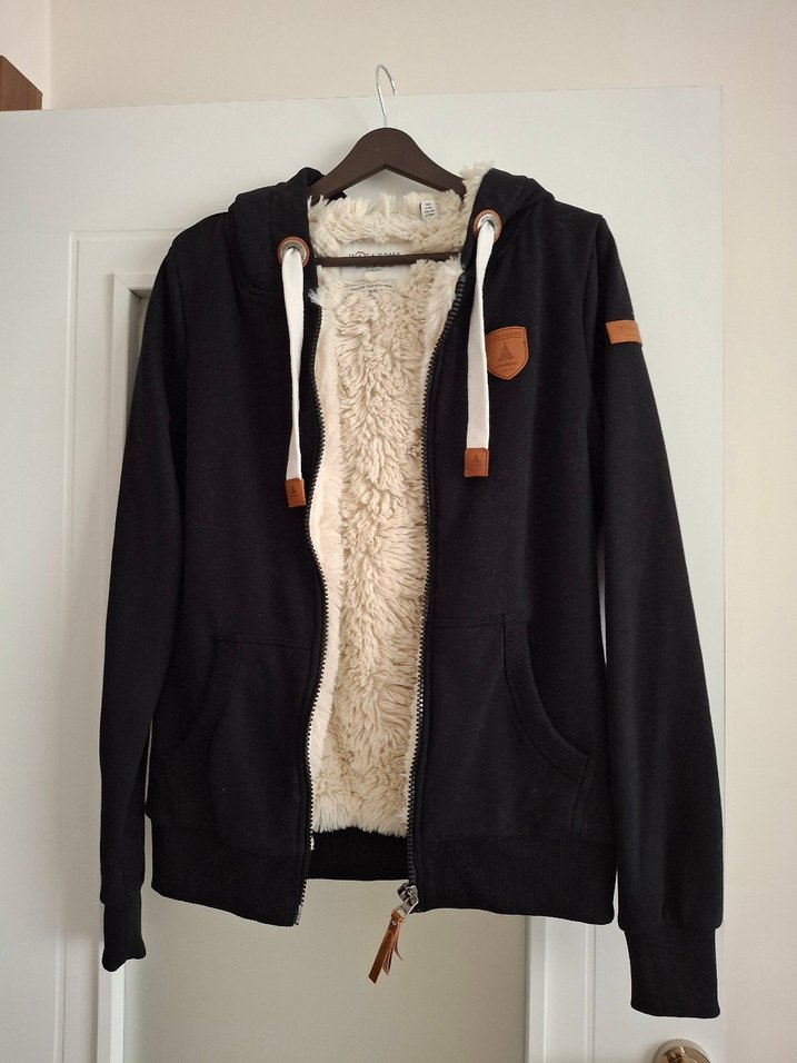 Siyah kapüşonlu, uzun kollu ve kürklü, rahat kesim kadın ceketi, Kanada markası Wanakome orijinal ürünüdür, bir ya da iki kez kullandım.