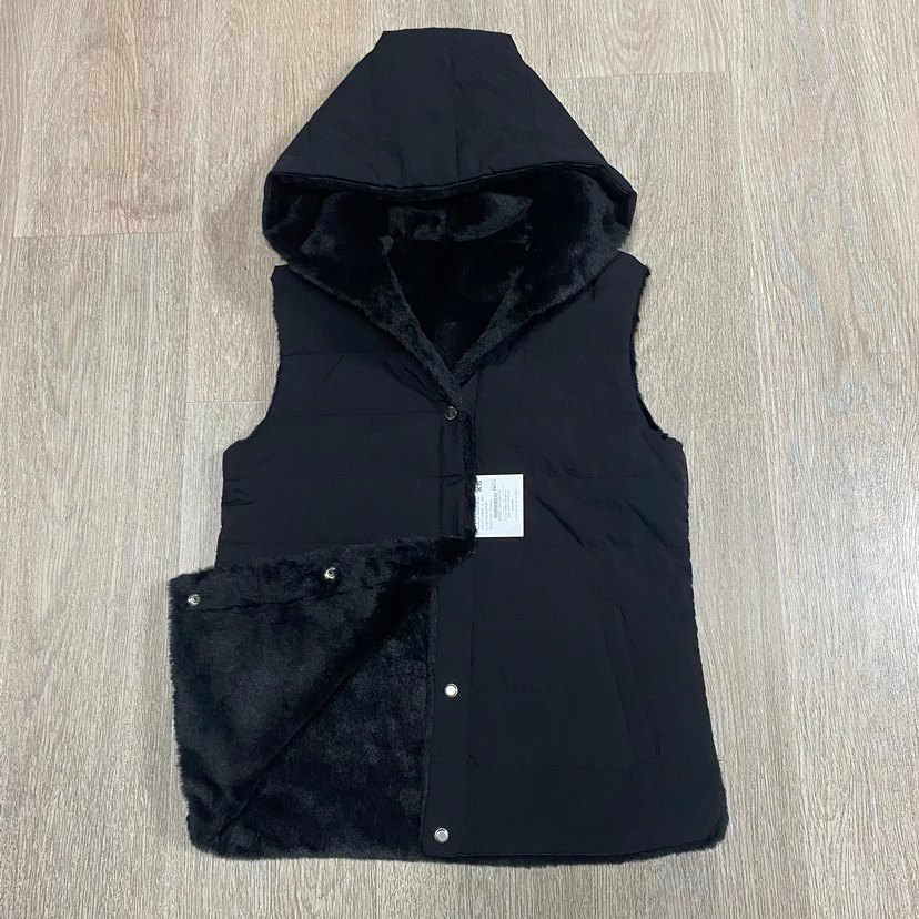 Siyah Kapüşonlu Kürklü Kadın Yelek.Çift Yönlü
