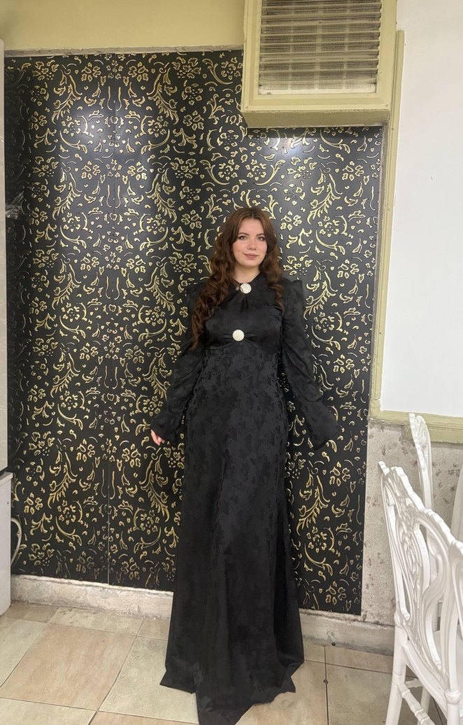 Kapüşonlu, kürk detaylı, desenli kumaştan uzun siyah elbise. Bol kesim ve uzun kollu, mütevazı gotik tarzda düğün için uygun. 40 bedendir