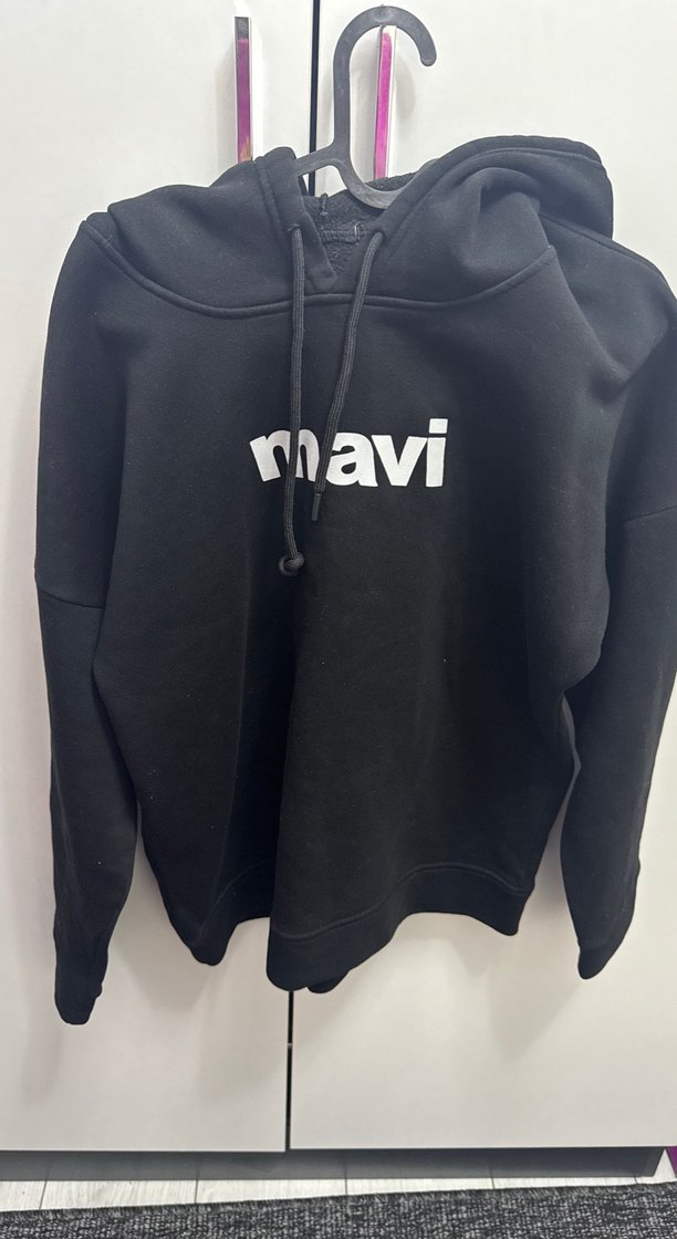 Siyah kapüşonlu, uzun kollu ve bol kesim sweatshirt, beyaz 'mavi' baskılı yumuşak ve sıcak kumaştan. Velcro detayı bulunur.