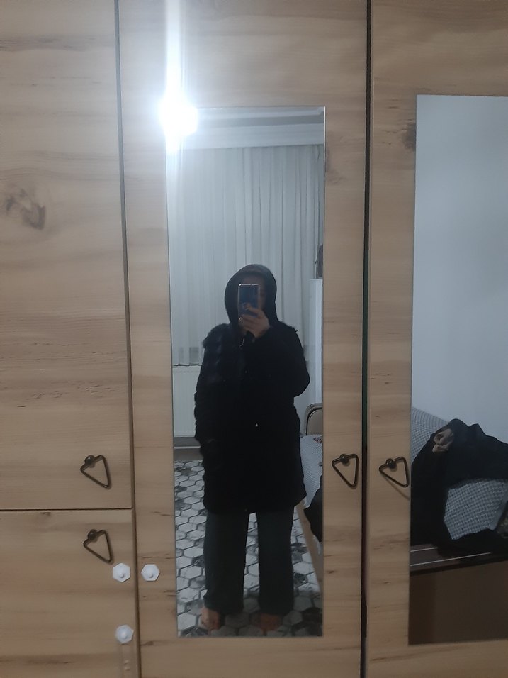 Bu siyah, midi boy kadın kadın polar kaban kapüşonlu ve uzun kolludur. Gevşek kesimiyle sokak stiline uygundur ve yumuşak, sıcak kumaştan üretilmiştir. Günlük kullanım için rahat ve şık bir tercihtir.