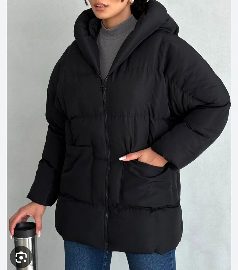 Siyah, kapüşonlu, cep detaylı, midi uzunlukta, bol kesim kadın kışlık mont. Notlu yaka ve askılı kollarıyla sokak stiline uygun.