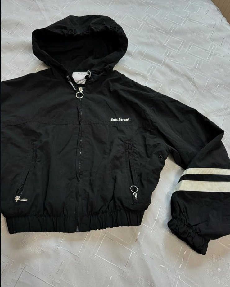 Siyah kapüşonlu ceket, bol kesim, fermuarlı ön, uzun kollu ve çizgili detaylıdır. Mini boyda, yumuşak ve sıcak kumaştan üretilmiştir.