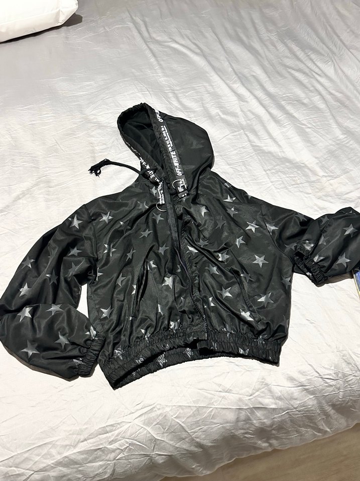 Siyah kapüşonlu kadın ceketi, bol kesim, uzun kollu ve fermuarlı. Sentetik kumaştan, mini boy ve yıldız desenli, rock punk tarzına uygun. S m bedene uygun ✨